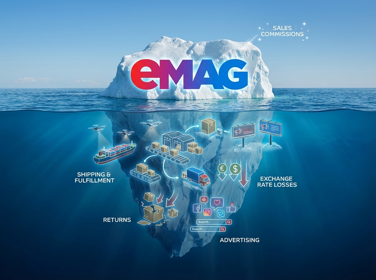 Prodej na eMAG Marketplace není zdarma – a skutečné náklady jsou vyšší, než se na první pohled zdá. Kromě provize z každého prodeje musíte počítat s dopravou, fulfillmentem, DPH v cílové zemi, náklady na vratky a fakturaci. Prodejce, který si spočítá jen provizi, často zjistí po prvním měsíci, že prodává se ztrátou. V tomto článku rozebereme všechny poplatky a skryté náklady prodeje na eMAG a ukážeme, jak správně kalkulovat marži, abyste věděli přesně, kolik vám z každé objednávky skutečně zbyde.